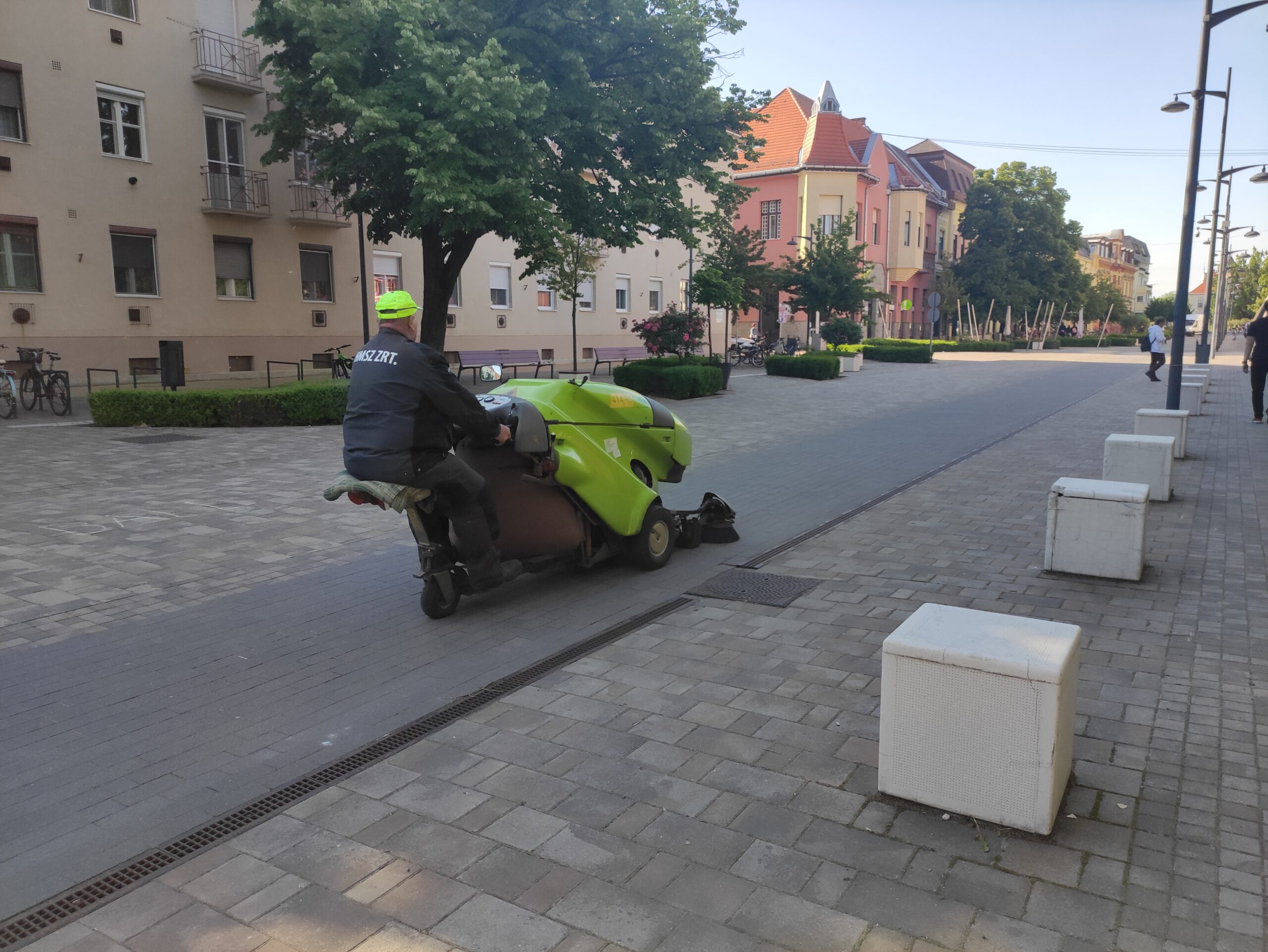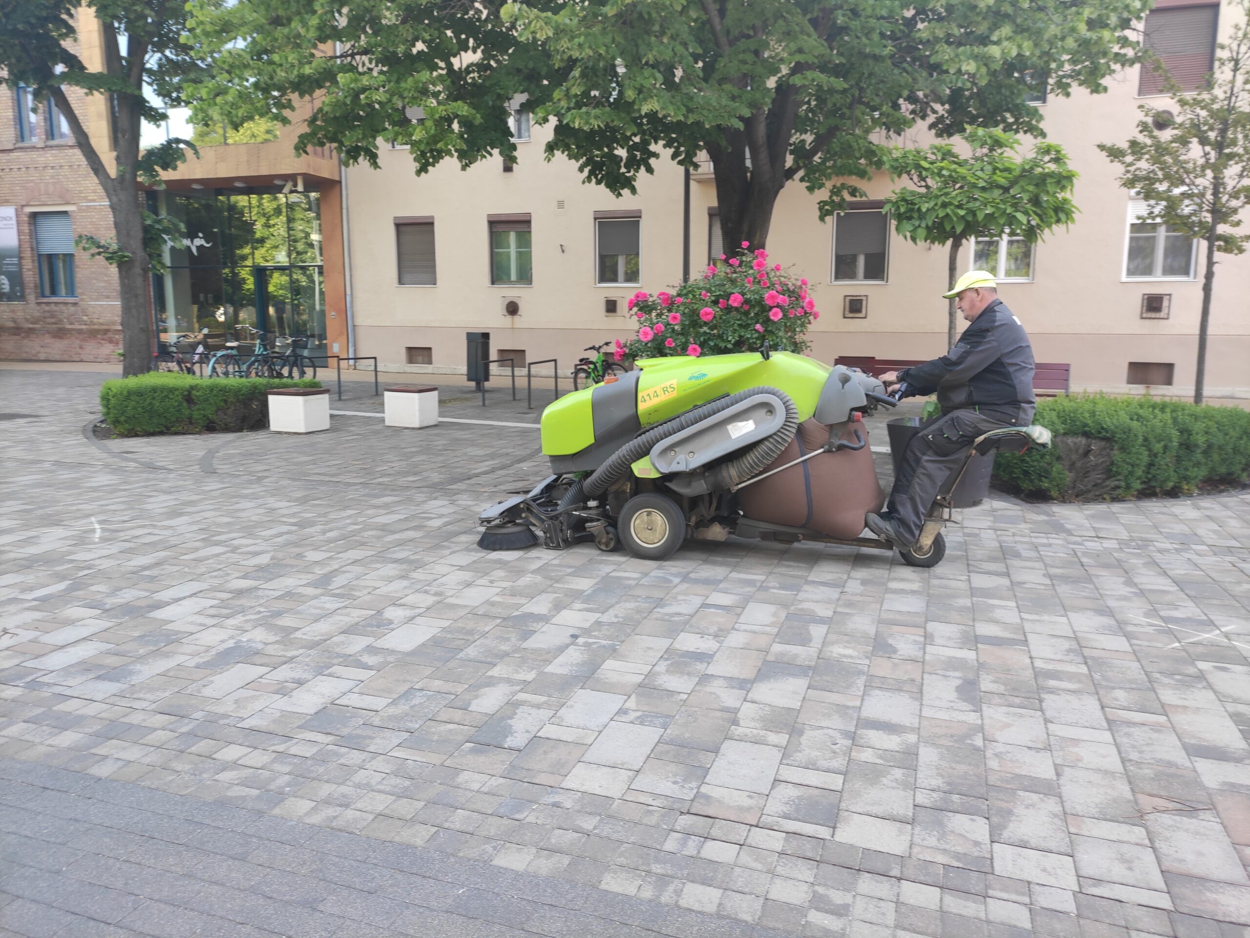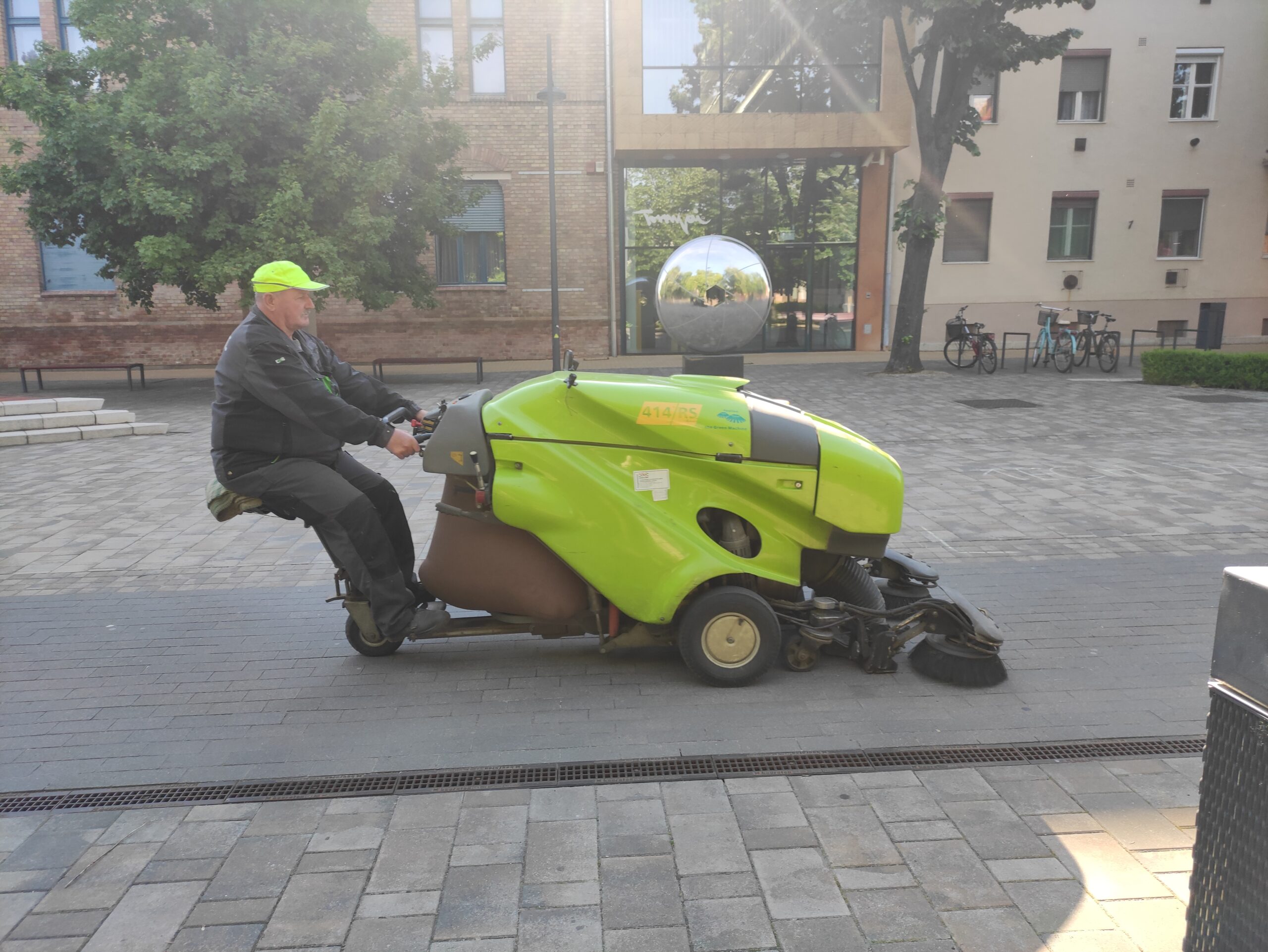 A Hódmezővásárhelyi Működtető és Szolgáltató Nonprofit Zrt. a város közterületein lévő parkolók takarítását végzi egy 414 RS típusú sepregetőgéppel.